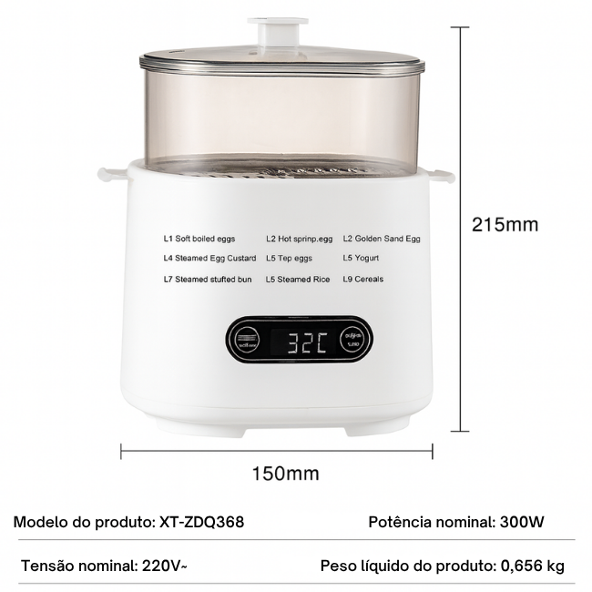 PAINEL TÁTIL INTELIGENTE:Simplifica a tua experiência culinária com um painel tátil intuitivo que permite ajustar com precisão o tempo e a temperatura. Com apenas um toque, prepara ovos perfeitos de forma rápida e prática — ideal para manhãs apressadas ou para quem valoriza a eficiência na cozinha.